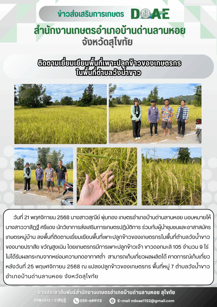 ติดตามเยี่ยมเยียนพื้นที่เพาะปลูกข้าวของเกษตรกร ในพื้นที่ตำบลวังน้ำขาว
