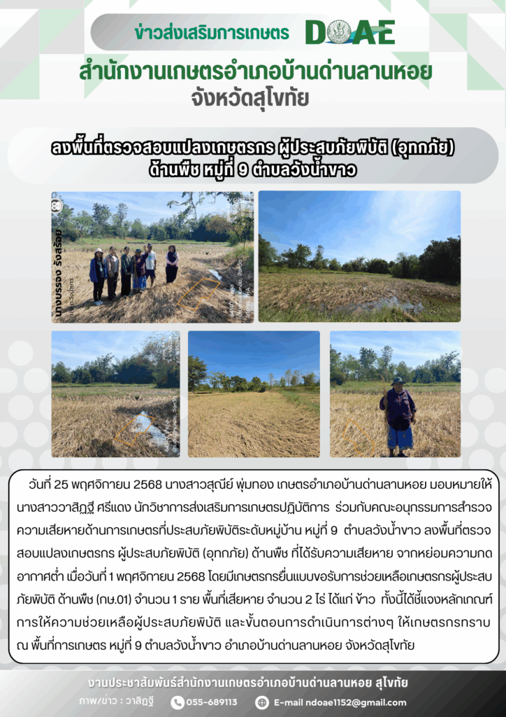 ลงพื้นที่ตรวจสอบแปลงเกษตรกร ผู้ประสบภัยพิบัติ (อุทกภัย) ด้านพืช หมู่ที่ 9 ตำบลวังน้ำขาวBy bandanlanhoi / 28 พฤศจิกายน 2025