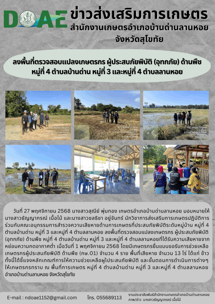 ลงพื้นที่ตรวจสอบแปลงเกษตรกร ผู้ประสบภัยพิบัติ (อุทกภัย) ด้านพืชBy bandanlanhoi / 28 พฤศจิกายน 2025 หมู่ที่ 4 ตำบลบ้านด่าน หมู่ที่ 3 และหมู่ที่ 4 ตำบลลานหอย