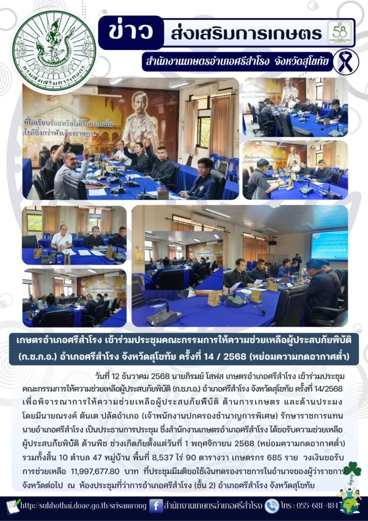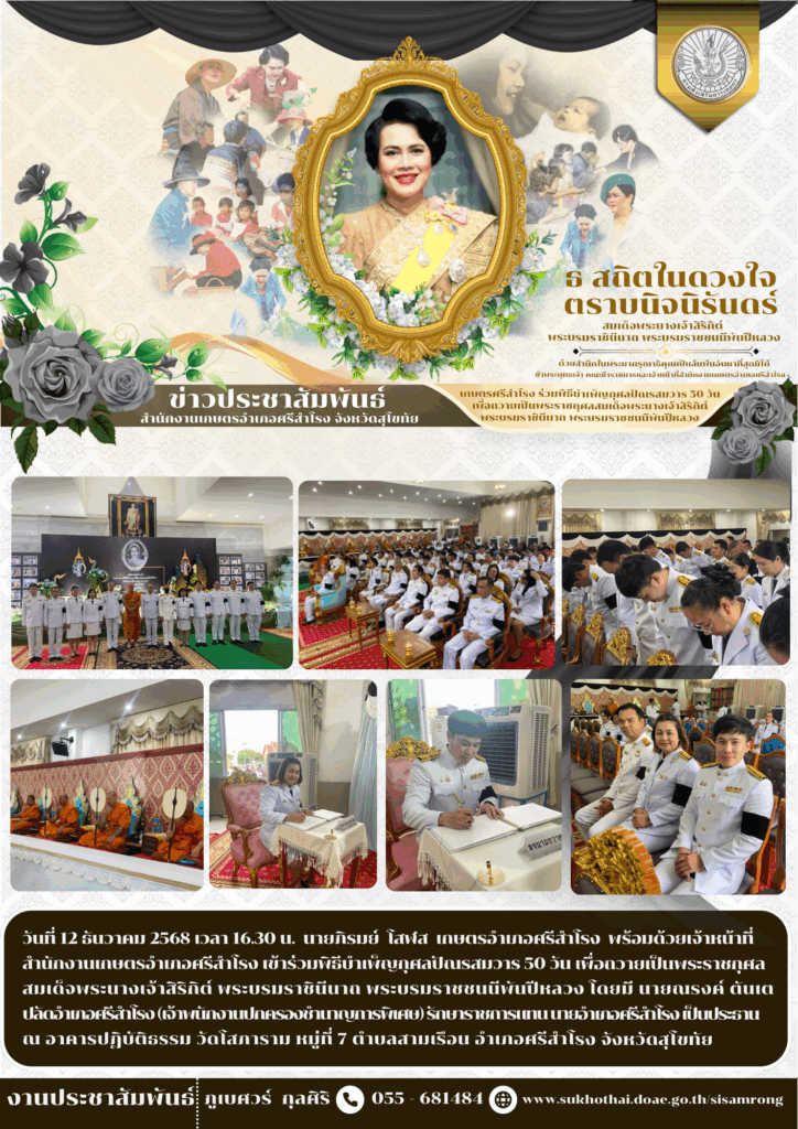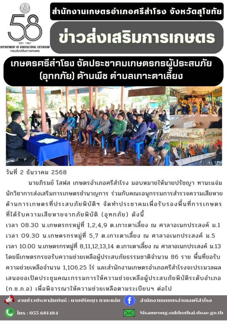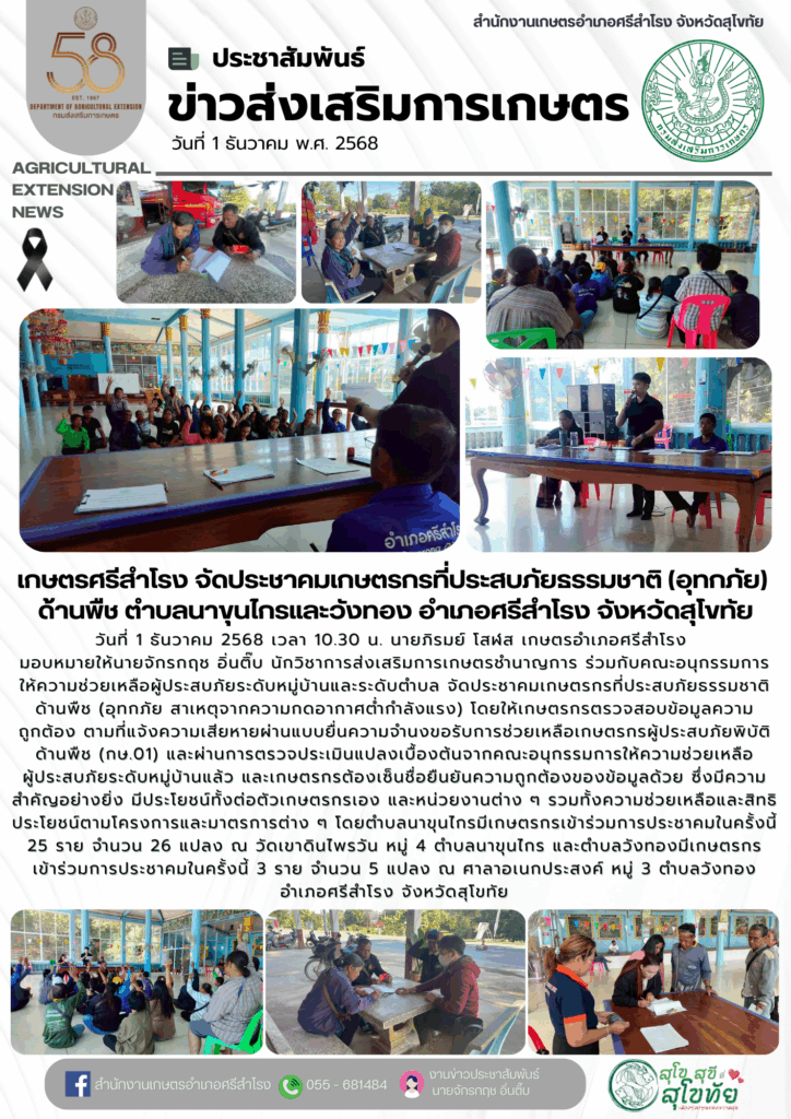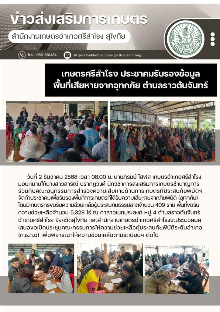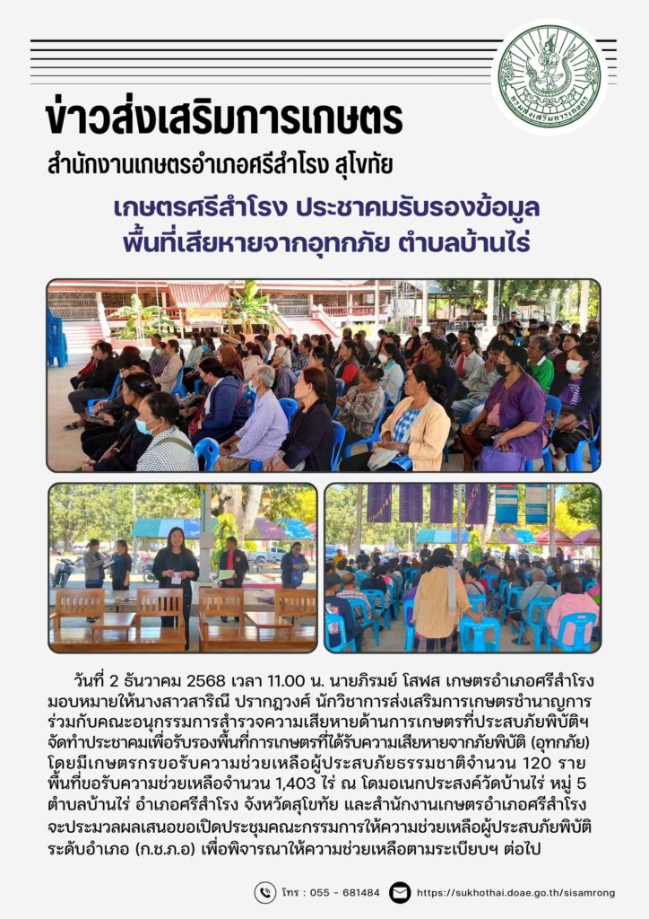ข่าวส่งเสริมการเกษตร ข่าวเตือนการระบาดศัตรูพืชข่าวประชาสัมพันธ์ หนาวแล้ว…ระวังข้าวกระทบหนาวอ่านต่อเตือนเฝ้าระวังศัตรูพืชระหว่างวันที่ 13 – 26 พฤศจิกายน 2568อ่านต่อแมลงบั่วในนาข้าวอ่านต่อ พี่น้องเกษตรกรโปรดทราบ! มาตรการเข้ม “หยุดเผา”อ่านต่อทางเลือกจัดการเศษวัสดุทางการเกษตรอ่านต่อ สมัครรับข่าวสาร แบบสำรวจความพึงพอใจเว็บไซต์ ข่าวรับสมัครงาน ::: สื่อประชาสัมพันธ์ ::: Click Click Click : สำหรับเจ้าหน้าที่ : ระบบทะเบียนเกษตรกร ระบบข้อมูลภัยธรรมชาติ ระบบวิสาหกิจชุมชน ระบบ T and V ระบบวาดแปลง Geoplot ระบบสารสนเทศเกษตรกรปราดเปรื่อง ระบบลงทะเบียนอาสาสมัครเกษตร ระบบสารสนเทศเกษตรแปลงใหญ่ ระบบ HRCS สมาชิกสหกรณ์ออมทรัพย์ สนง.เกษตรจังหวัดสุโขทัย ระบบทะเบียนประวัติอิเล็กทรอนิกส์ (SEIS) ระบบ Mail Box กรมส่งเสริมการเกษตร ระบบค้นหาตรวจสอบที่ดิน (Online) ระบบ E-learning กรมส่งเสริมการเกษตร ระบบ E-learning ข้าราชการพลเรือน (กพ) ระบบ GIS-AGRO 4.0 ระบบฐานข้อมูลเกษตรกรผู้เข้าร่วมการส่งเสริมการเกษตร ระบบใบรับรองเงินเดือนข้าราชการ ระบบสมาชิกสหกรณ์ออมทรัพย์ กรมส่งเสริมการเกษตร :: ข้อมูลติดต่อสำนักงาน :: สำนักงานเกษตรอำเภอศรีสำโรงหมู่ที่ 5 ตำบลคลองตาลอำเภอศรีสำโรง จังหวัดสุโขทัยรหัสไปรษณีย์ 64120เบอร์โทรศัพท์ : 055 – 681484 ธรรมาภิบาลองค์กร ลิขสิทธิ์สำนักงานเกษตรอำเภอศรีสำโรง © 2025