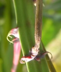 มีสาเหตุจากเชื้อรา สภาพที่มีความชื้นสูงติดต่อกันมากกว่า 2 สัปดาห์ ในพันธุ์ที่อ่อนแอ เช่นระยอง 72 ระยอง 11 ความเสียหาย 80 % ส่วนพันธุ์ที่ค่อนข้างทนทาน ยอดจะเหี่ยวแห้งตายลงมาทำให้เกิดมีการเจริญเติบโตของกิ่งหรือยอดใหม่ น้ำหนักผลผลิตจะลดลงหรือเก็บเกี่ยวล่าช้า ผลผลิตจะเสียหาย 30 – 40 %