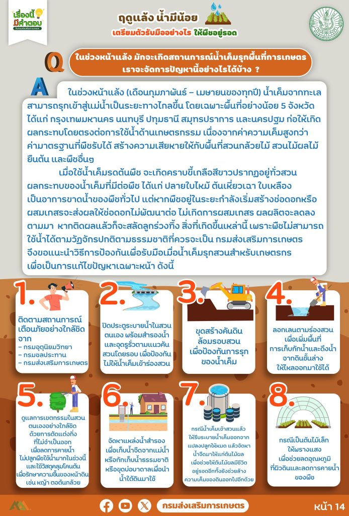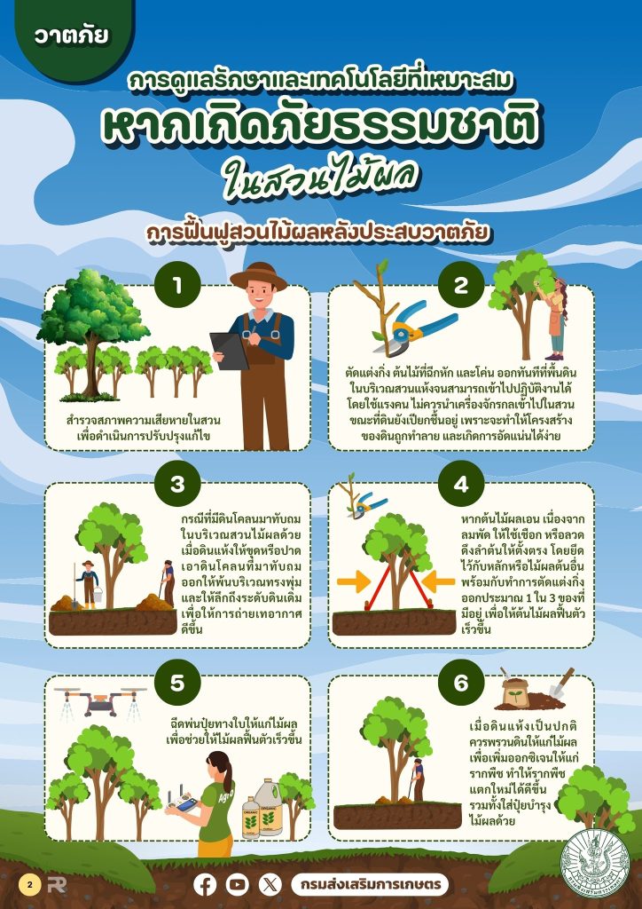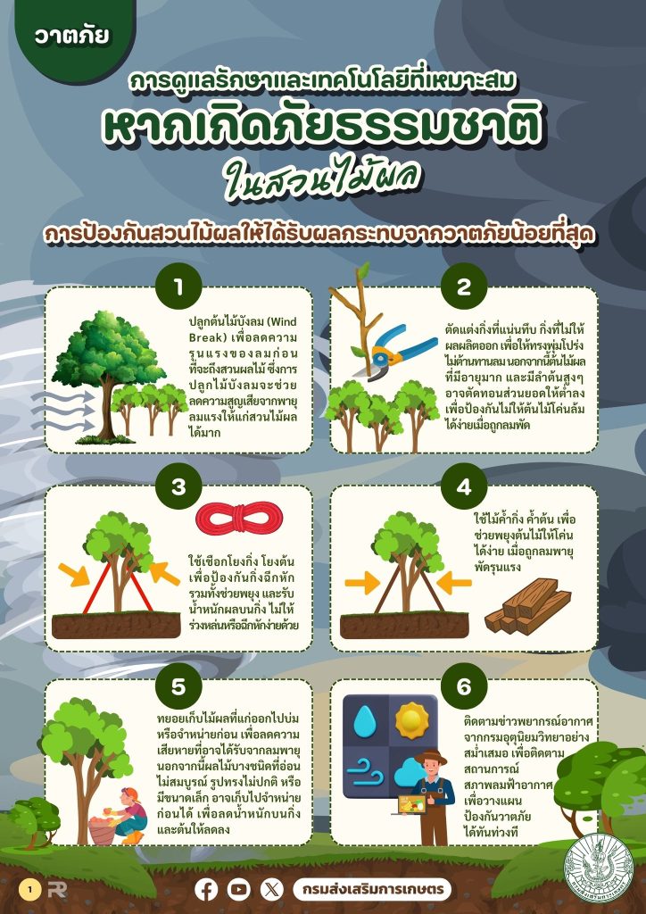 📣 เตือนเกษตรกร !!! เฝ้าระวังฝนตกหนักถึงหนักมาก หวั่นส่งผลกระทบระหว่างวันที่ 14 – 17 กรกฎาคม 2567 สำหรับเกษตรกรควรเตรียมการป้องกันและระวังความเสียหาย ที่จะเกิดต่อผลผลิตทางการเกษตรไว้ด้วย กรมส่งเสริมการเกษตรมีคำแนะนำการดูแลรักษา และเทคโนโลยีที่เหมาะสมเมื่อเกิดวาตภัยในสวนไม้ผล เกษตรกรควรดำเนินการ ดังนี้